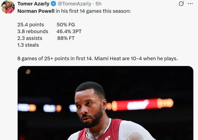 这也是鲍威尔开季至今火热表现的缩影,场均可以拿到25.4分3.8篮板2.3助攻1.3抢断,整体命中率50%,三分命中率46.4%。