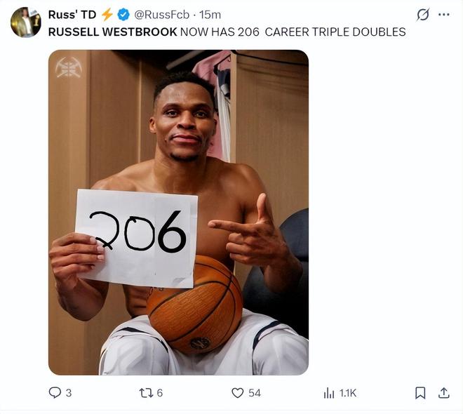 美媒晒出威少的数据写道:即便是威少已经37岁,他在NBA的表现依旧非常出色,206次三双刷新自己的纪录。
