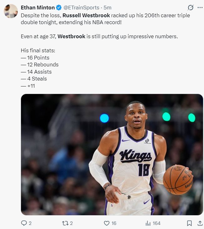 北京时间11月29日,NBA杯赛,国王以119-128不敌爵士吞下二连败。此役拿着不保障底薪360万的威少拿到16分14助攻12篮板4抢断的全面数据,但球队一直处于落后,威少生涯第206次三双,他是国王的孤胆英雄,拿着363万的老将底薪显得很悲情。