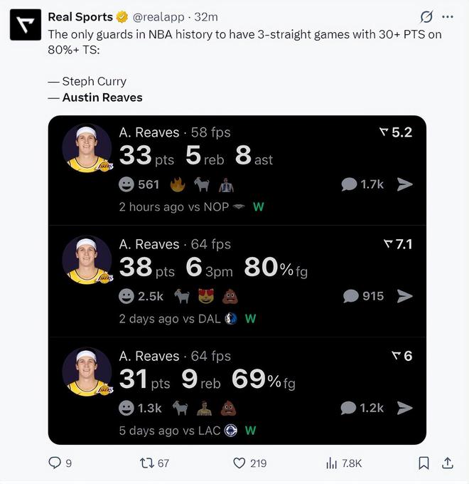 过去的三场比赛里夫斯全部拿到30+,合计拿到102分且真实命中率超过80%,里夫斯是库里后首位连续三场30+且真实命中率达到80%的后卫。
