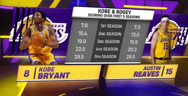 里夫斯跟科比都打湖人的得分后卫,这个场均数据的提升幅度也类似,不同是里夫斯是一个落选秀,科比是首轮13顺位。