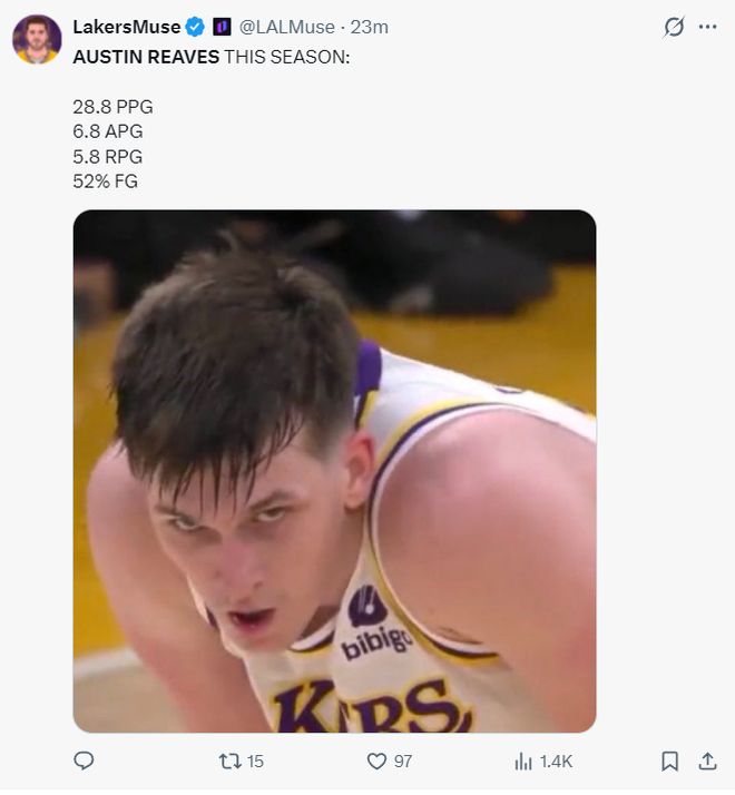 没有勒布朗-詹姆斯,东契奇、里夫斯联手依旧拿到大胜,这两人又都上20+,对阵鹈鹕与上一场对阵独行侠一样,东皇+里皇两人都上30+,湖人豪取七连胜稳居西部次席,里夫斯本赛季的成长过于喜人。