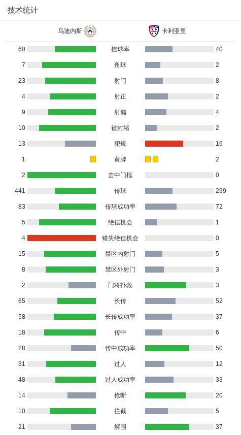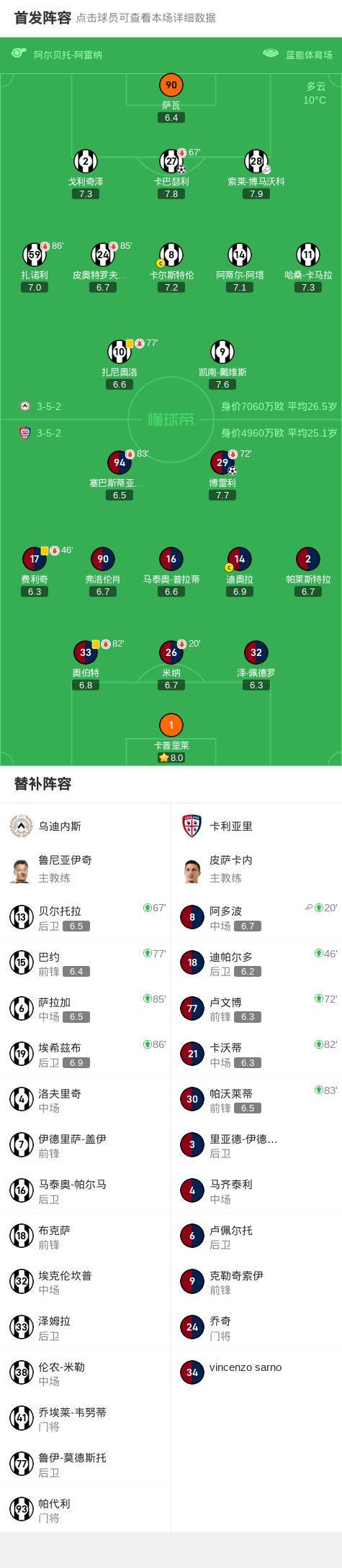 乌迪内斯1-1卡利亚里,博雷利破僵,卡巴瑟利扳平比分