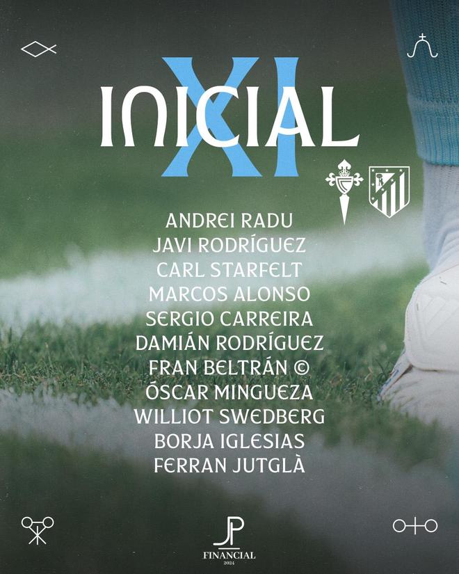 塞尔塔首发阵容:13-拉杜、20-阿隆索、2-斯塔费尔特、32-加利亚诺、8-贝尔特兰、3-明格萨、9-尤特格拉、5-卡雷拉、19-斯威德伯格、14-罗德里格斯、7-伊格莱西亚斯