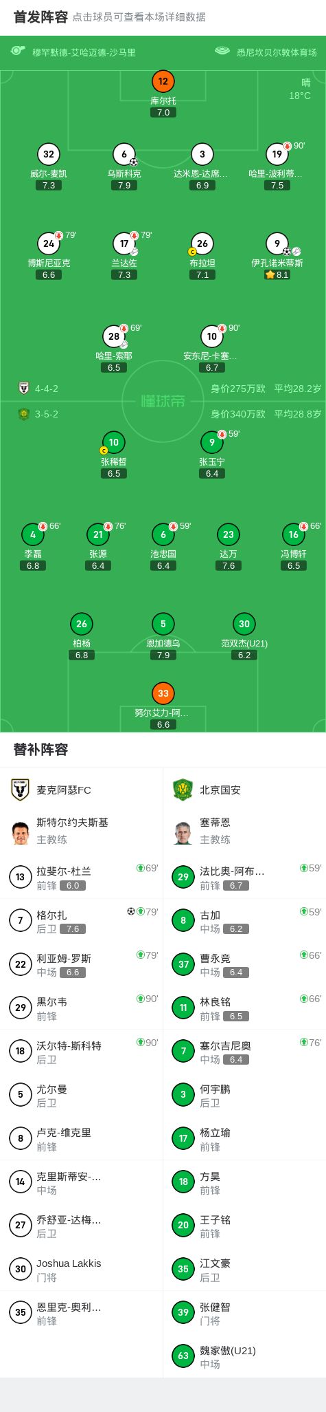 亚冠二级开局2轮仅1分,国安客场0-3麦克阿瑟FC,全队仅2次射正