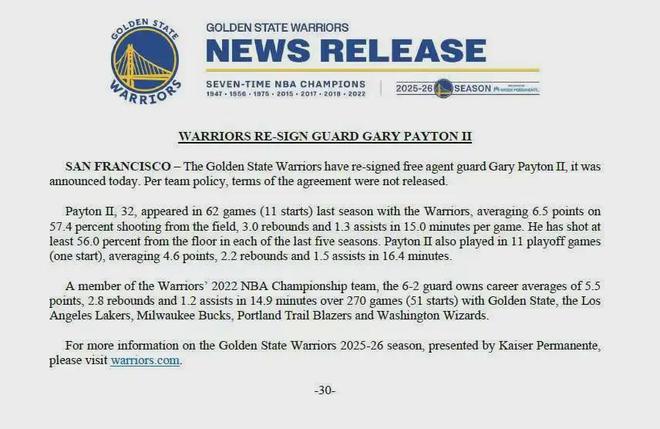 全额保障!Scotto:勇士与小佩顿签下1年330万美元合同